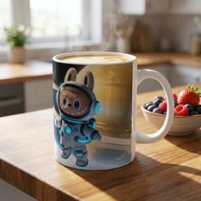 Labubu Coffee Splash Canvas Print — Funny Clumsy Monster Wall Art — Whimsical Kitchen & Office Decor