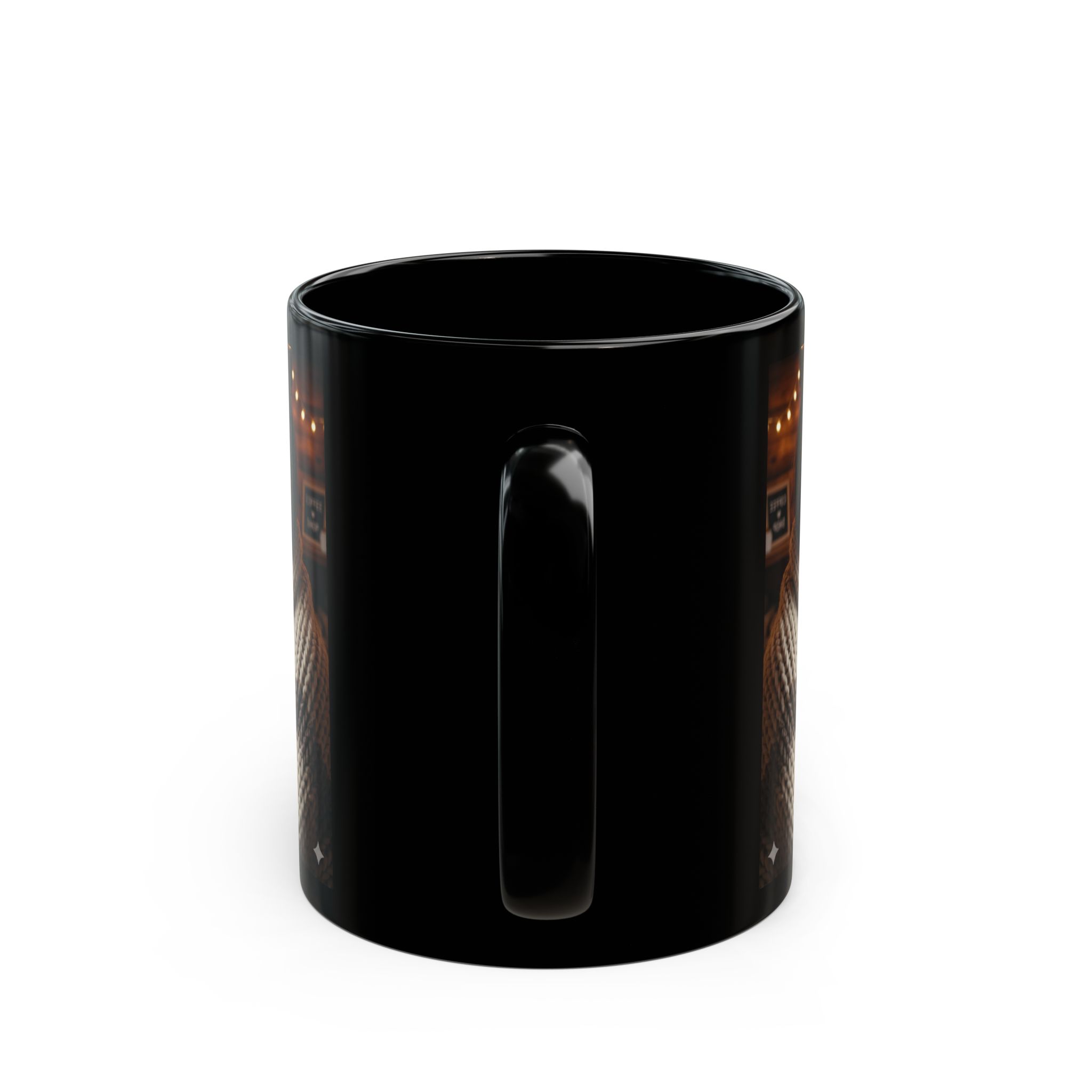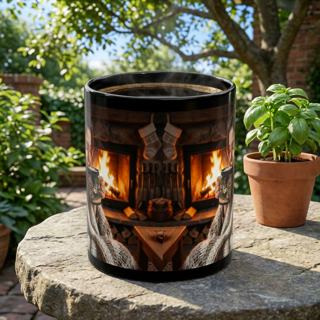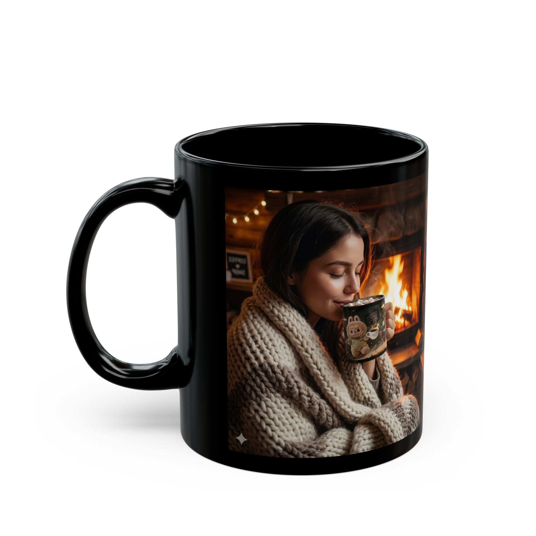 Christmas Bonfire Lady Hot Cocoa Black Mug — Cozy Holiday Coffee Cup (11oz)