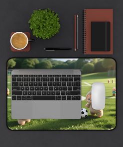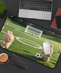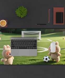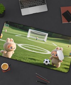 Spread a little playful joy across your workspace with this soft neoprene desk mat featuring cuddly Labubu mascot bunnies on a sunlit soccer field.