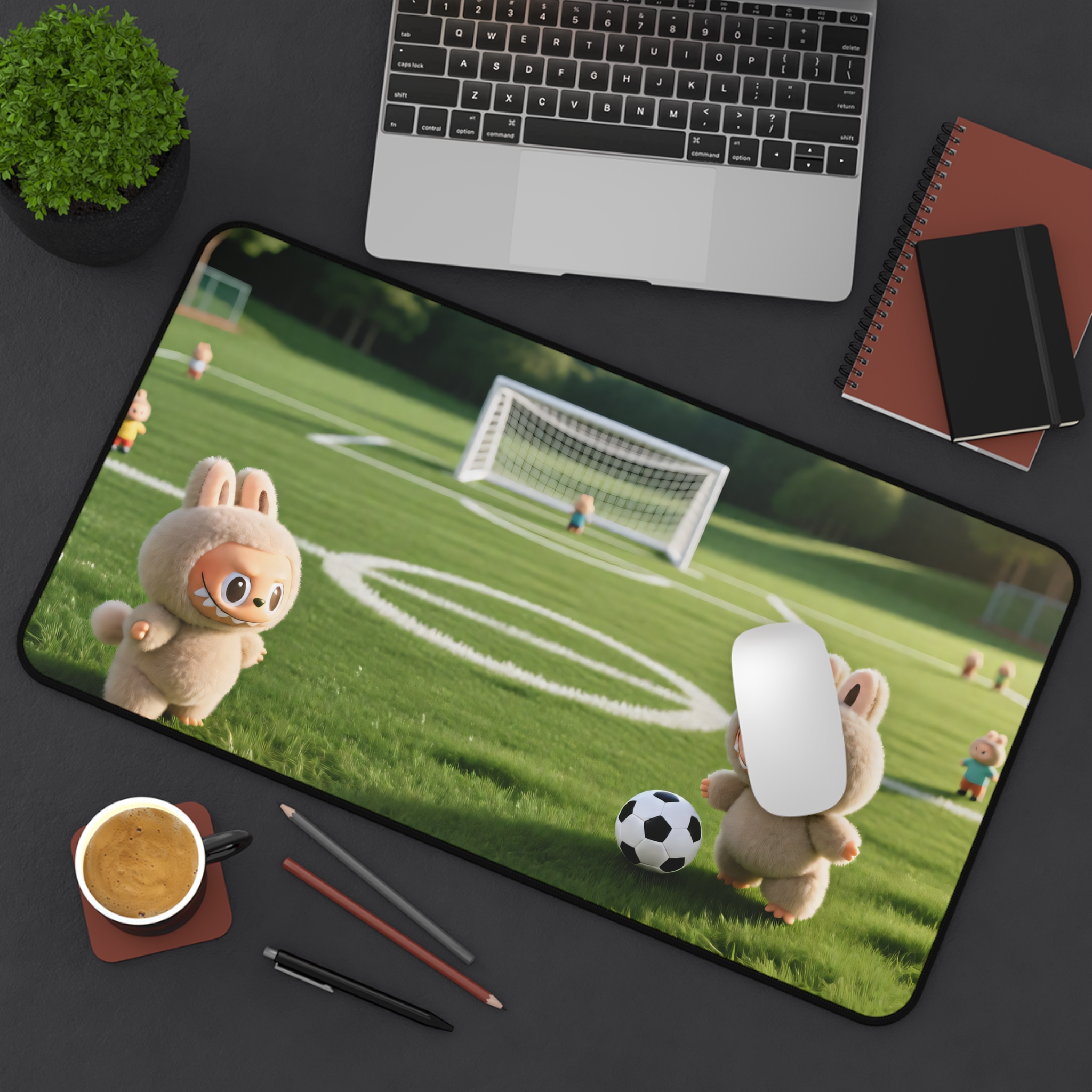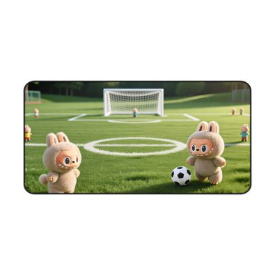 Spread a little playful joy across your workspace with this soft neoprene desk mat featuring cuddly Labubu mascot bunnies on a sunlit soccer field.