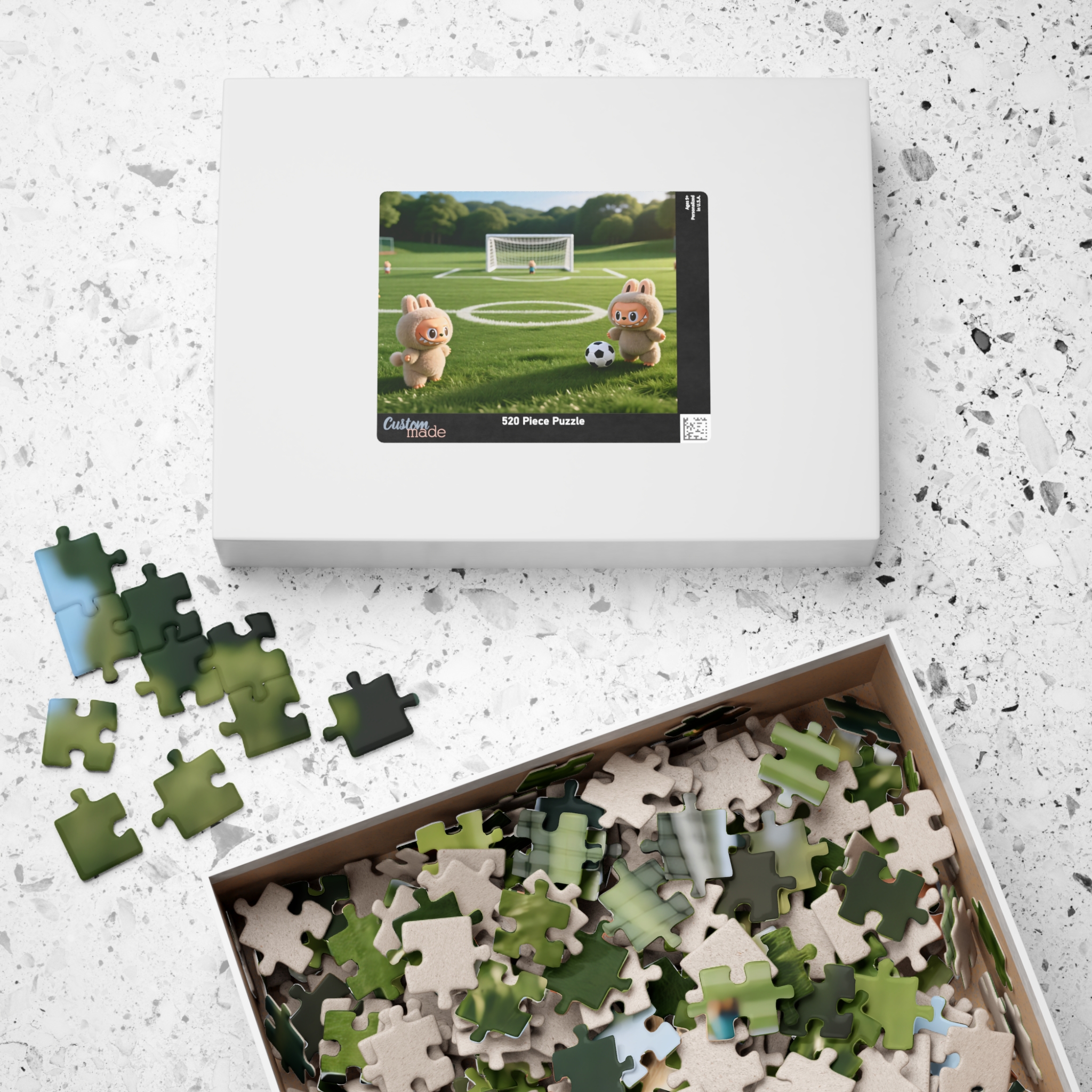 This cozy chipboard puzzle brings a soft, playful scene to your table — two fuzzy bunny characters on a sunny soccer field, mid-game with a tiny ball and goal in the background. Each piece snaps together with a glossy, vibrant print that holds the image’s warm greens and gentle highlights. Work it solo as a calming break, or spread it across the coffee table for a relaxed afternoon with friends or family. When finished it makes a charming display, and the included paper box features the artwork on top for neat storage or easy travel to a puzzling meetup.