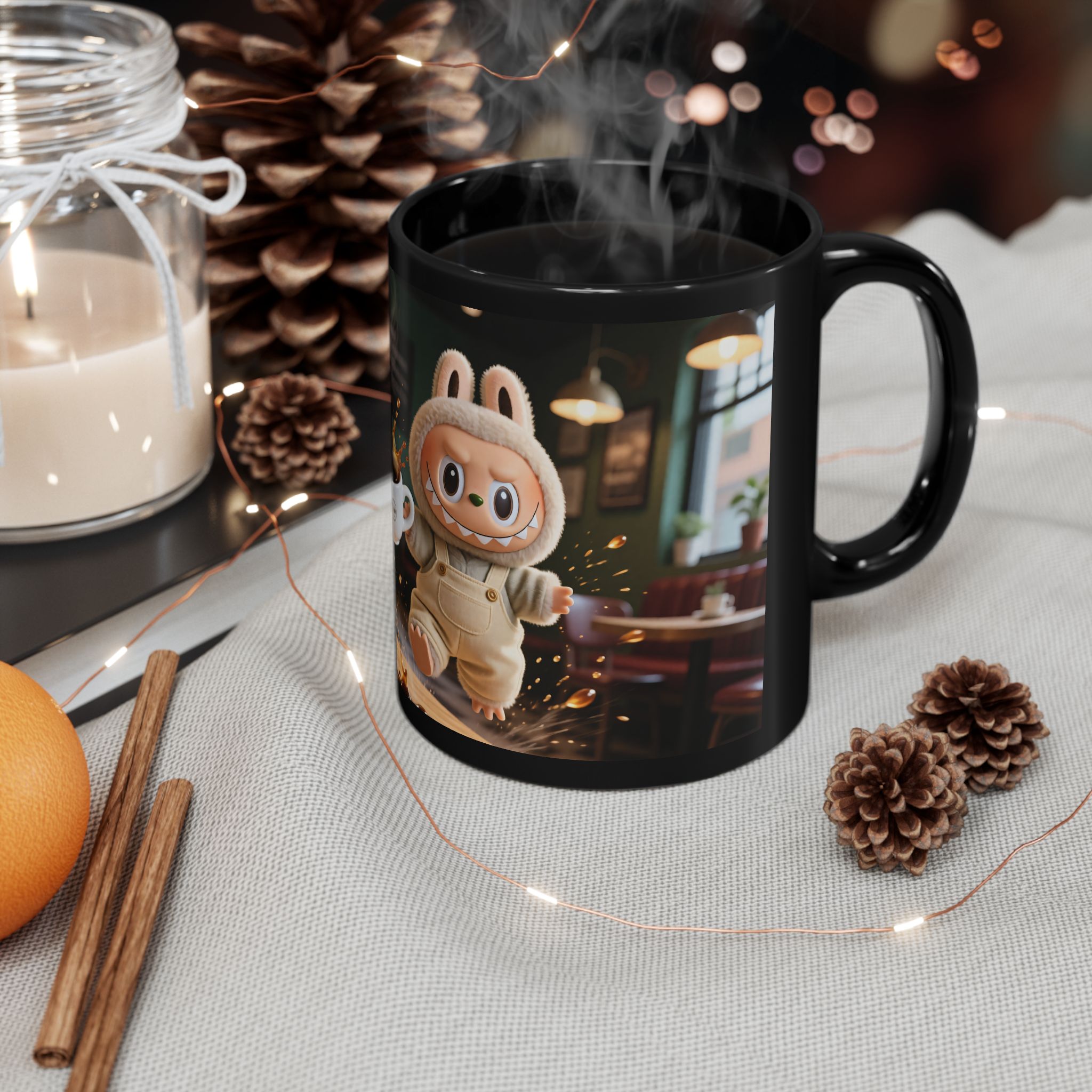 labubu Coffee Leap Black Ceramic Mug — Energetic Labubu Cafe Scene 11oz/15oz