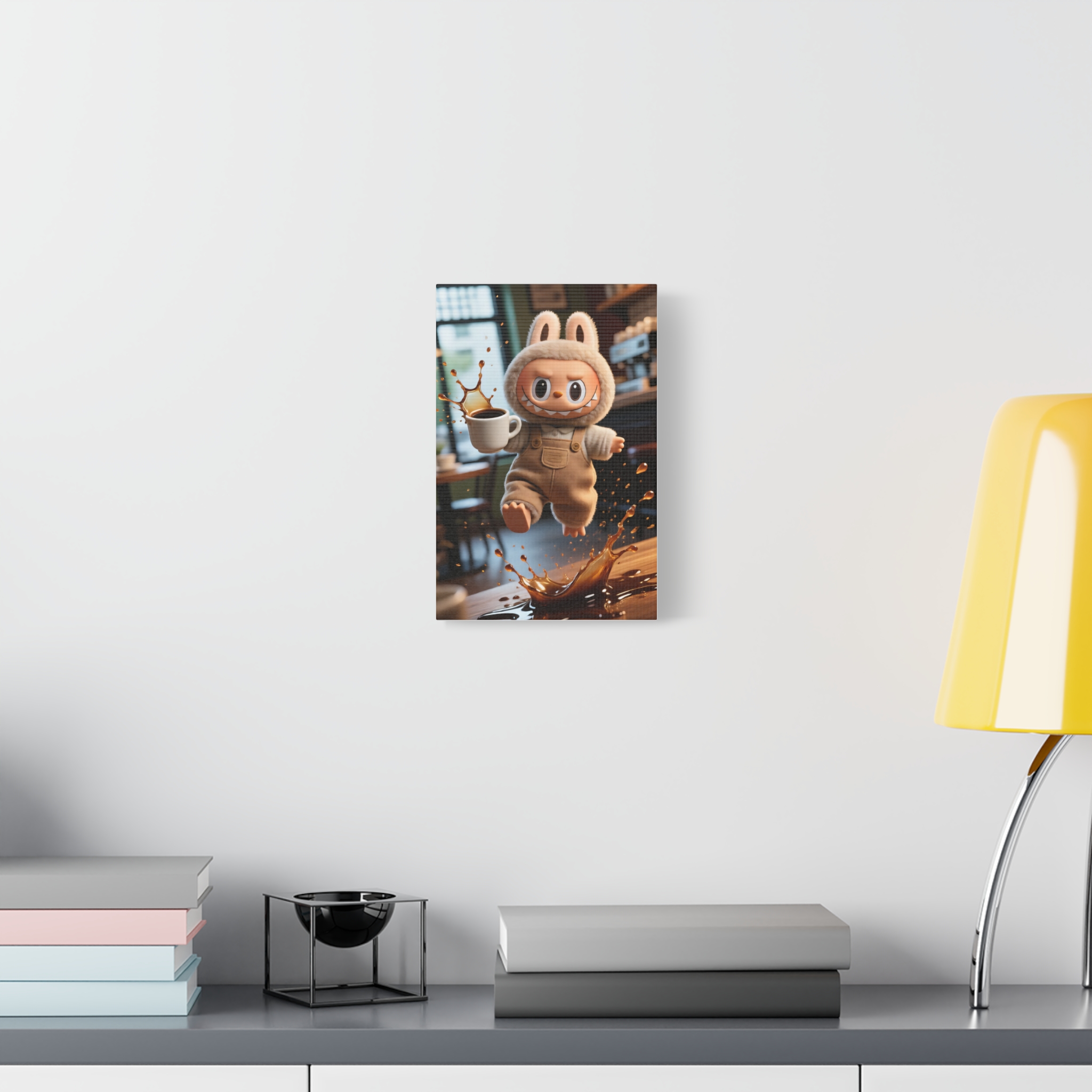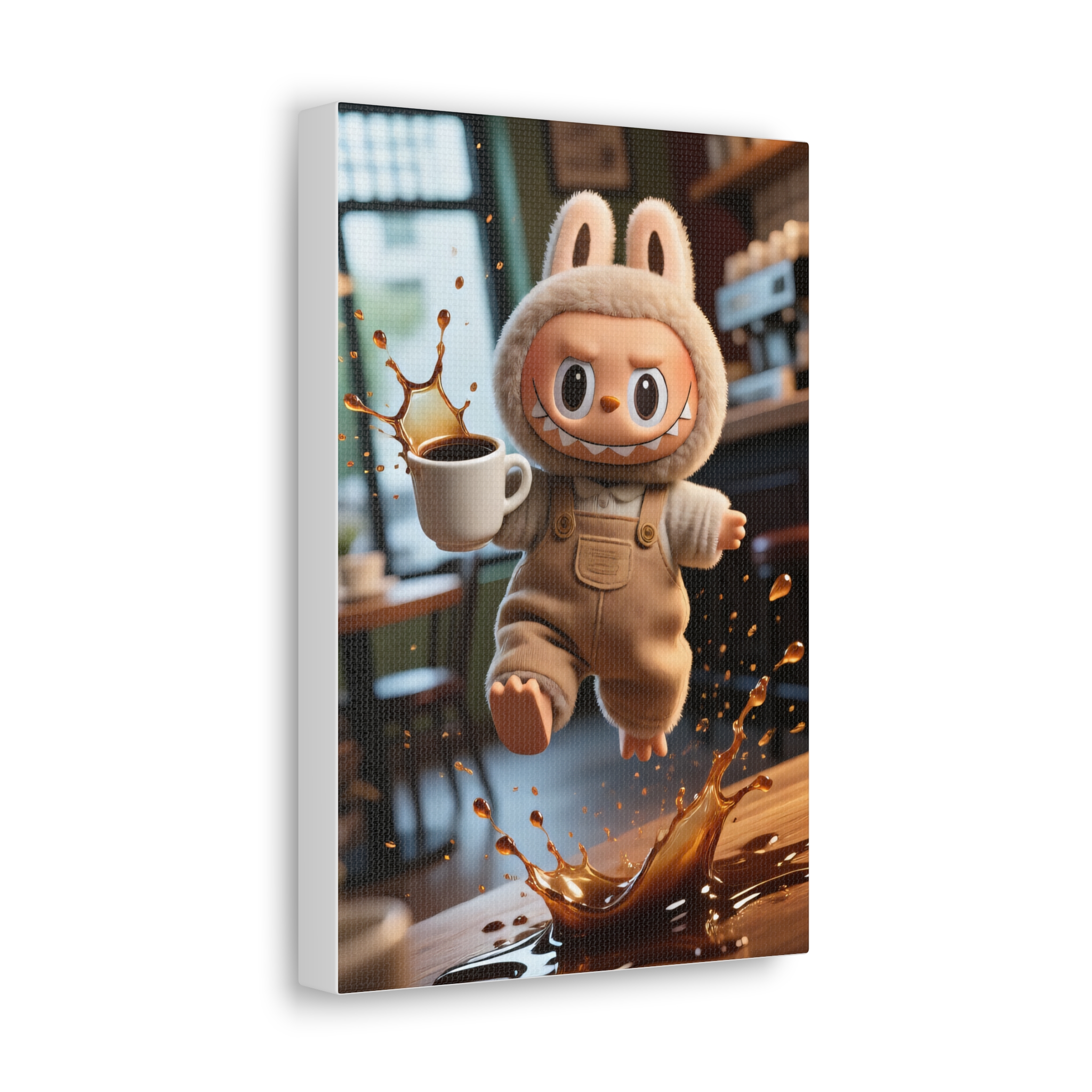 Labubu “Coffee Splash” Canvas Print — Funny Clumsy Monster Wall Art — Whimsical Kitchen & Office Decor